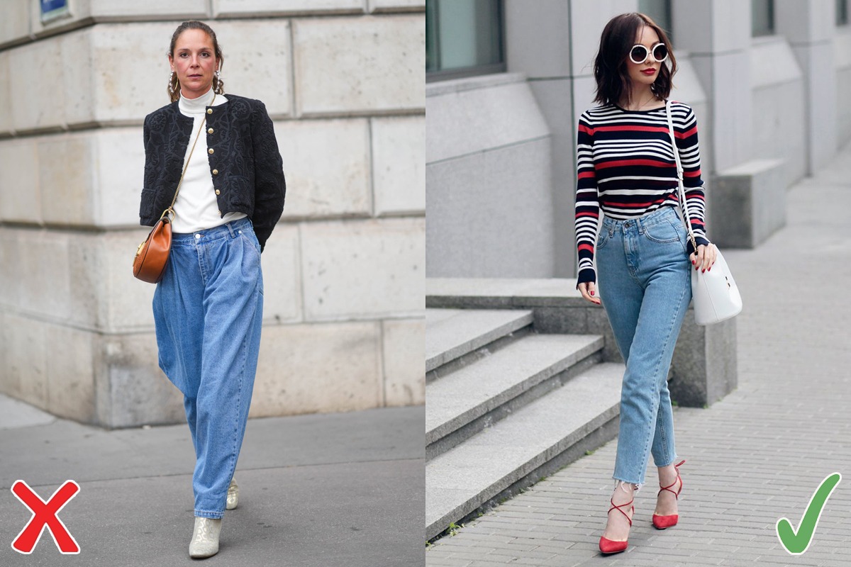 Dáng quần phồng hông, ôm dần về phía ống đã thuộc về quá khứ vì khiến thân dưới của người mặc trông đồ sộ hơn, eo và chân càng đầy đặn. Thay vào đó, một chiếc quần dáng mom jeans với cạp cao, hông phồng vừa phải và dáng đứng sẽ giúp thân hình thêm quyến rũ, cân đối.