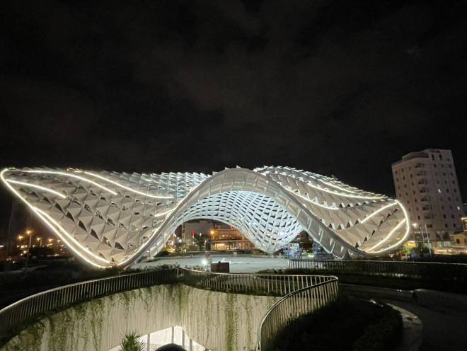 Chiếu sáng trang trí bên ngoài mái vòm sử dụng 8 đèn pha đổi màu công suất 150W và chiếu sáng bên trong mái vòm sử dụng 12 đèn pha đổi màu công suất 80W, ngoài ra, mặt trên mái vòm tại vị trí các khung sườn thép có tăng cường chiếu sáng bằng các đèn led dây để trang trí. Công trình khởi công từ 15/10/2020, thời gian hoàn thành 10/1/2022.