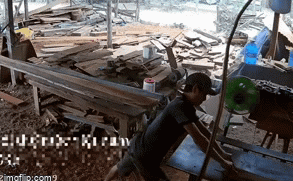 Cụ thể, lúc này một người đàn ông đang dùng tay đẩy tách đôi thanh gỗ trên máy cưa bàn. Khi người này nâng nhẹ tay lên khiến khúc gỗ bung ra, bật thẳng một đầu, vụt trúng vùng bụng của người thợ mộc.