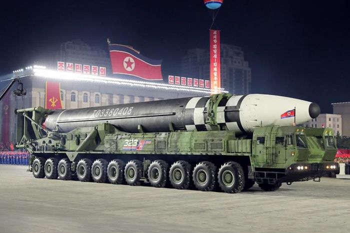 Tên lửa đạn đạo liên lục địa (ICBM) của Triều Tiên trong cuộc diễu binh ở Bình Nhưỡng ngày 10/10/2021. Ảnh: KCNA