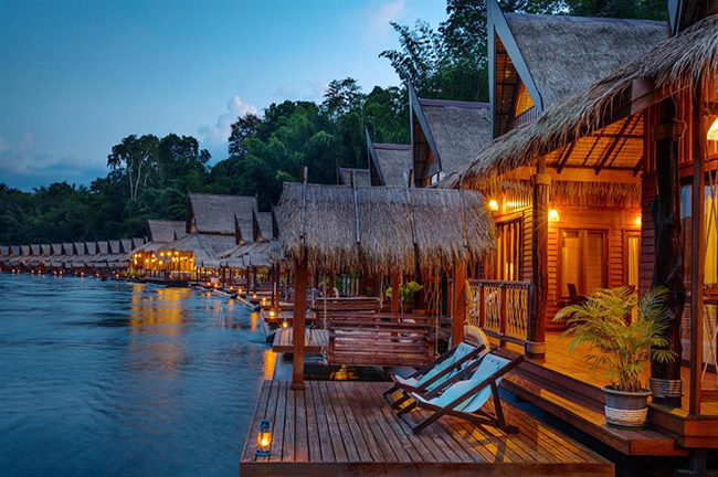 The Float House, River Kwai Resort, Thái Lan: Mỗi biệt thự đều có hiên riêng nằm trực tiếp trên mặt nước, với xích đu và ghế ngồi ngoài trời để tắm nắng. Với thiết kế chủ yếu là gỗ và tranh, khách sạn kết hợp rất hài hòa với khu rừng xung quanh.