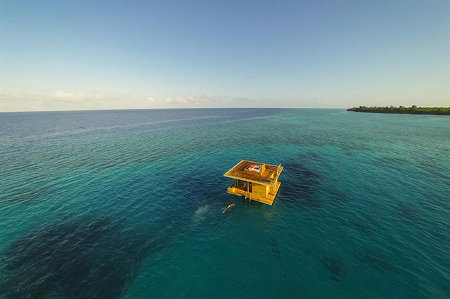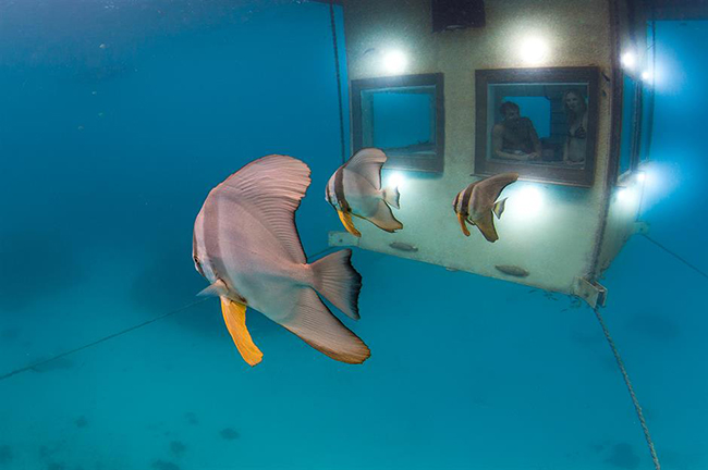 Chỉ có thể đi bằng thuyền từ khu nghỉ mát chính ra biệt thự dưới nước này. Biệt thự gồm 1 boong trên cùng để tắm nắng và ngắm sao, tiếp đó là hàng hiên râm mát bên dưới. Và bạn sẽ ngủ với những chú cá ở đây, vì phòng ngủ nằm dưới mực nước biển với tầm nhìn tuyệt đẹp ra các sinh vật biển đầy màu sắc bơi lội trên mặt nước xung quanh.