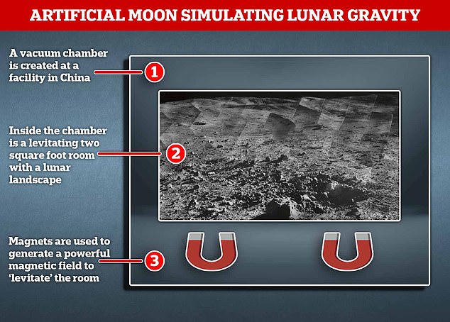 Các nhà nghiên cứu Trung Quốc đang phát triển một cơ sở có thể mô phỏng lực hấp dẫn của bề mặt Mặt trăng, tờ South China Morning Post đưa tin. Mặt trăng nhân tạo sẽ là một buồng chân không sử dụng từ trường mạnh để tái tạo môi trường trọng lực thấp.