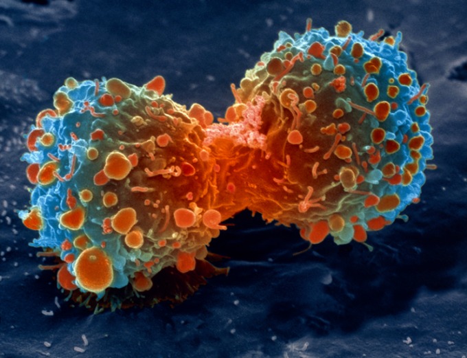 Ảnh chụp trên kính hiển vi của một tế bào ung thư phổi đang trong quá trình phân chia, lúc này các khối u thường có đồng hồ sinh học bất thường.