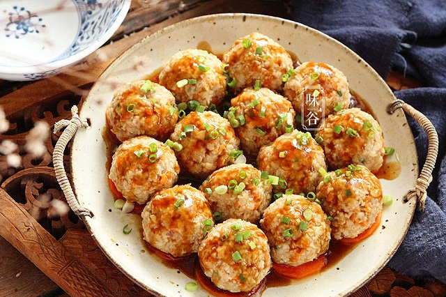 Thịt viên sau khi hấp xong thì rưới nước sốt và hành lá đã cắt nhỏ lên trên là có thể thưởng thức.