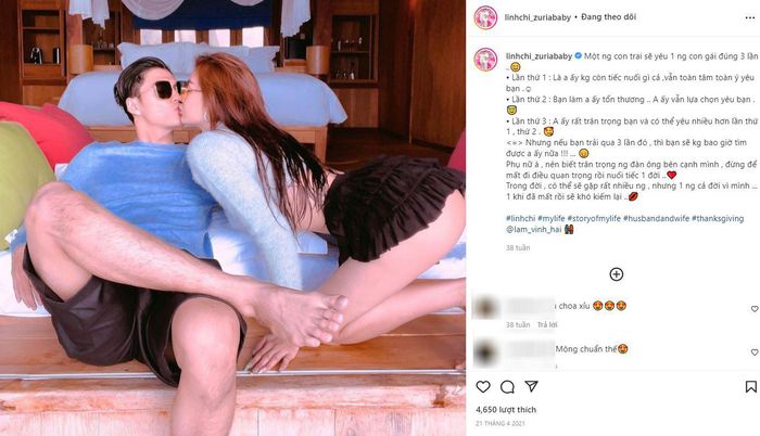 Phẫn nộ càng đẩy lên đến đỉnh điểm khi vợ cũ Lâm Vinh Hải tố lên tố xuống trong khi Linh Chi cứ thản nhiên đăng tải hình ảnh mùi mẫn, có phần nhạy cảm kèm theo cả loạt triết lý hạnh phúc "hồn nhiên" như không.
