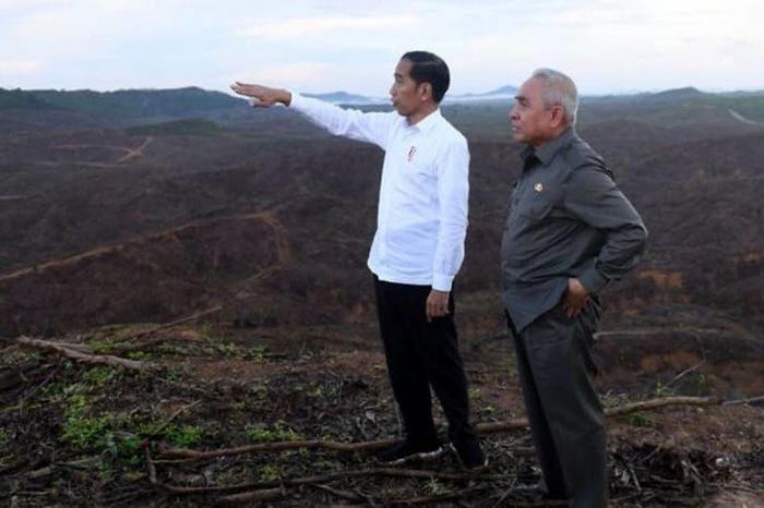 Tổng thống Joko Widodo (áo trắng) cùng thủ hiến tỉnh Đông Kalimantan trong chuyến thăm khu đất thuộc quận Bắc Penajam Paser, được chọn làm nơi xây dựng thủ đô mới Nusantara. Ảnh: Reuters