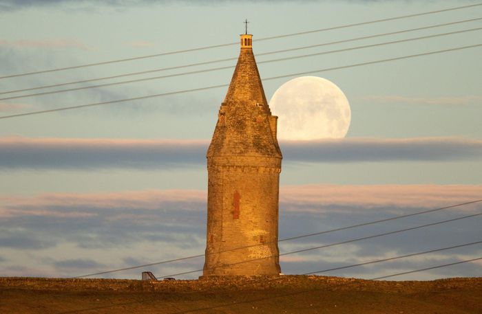 Trăng Sói huyền bí lấp ló đằng sau tàn tích cổ Mow Cop Folly ở Cheshire, Anh. Ảnh: Carl Recine / Reuters.