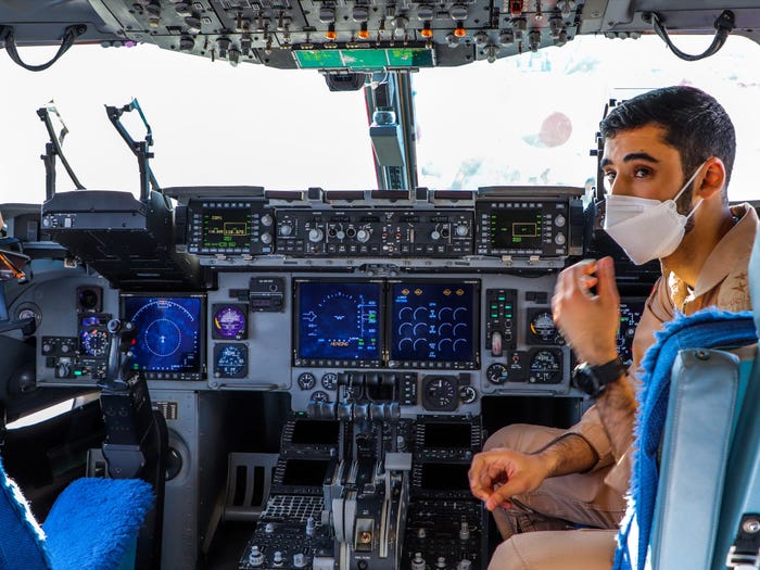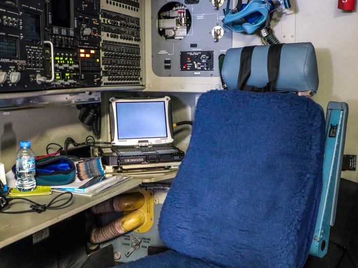 Buồng lái của C-17 ở tầng trên của máy bay, phía trên khoang chở hàng. Và khoang lái cũng thiếu thẩm mỹ tương tự như khoang chở hàng.