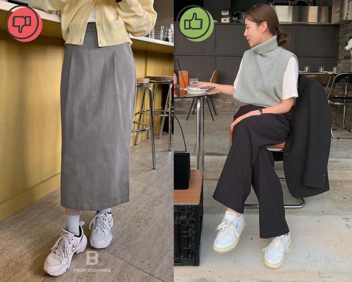 Đang diện một set váy vóc xinh tươi, điệu đà, nếu bạn đi một đôi chunky sneaker, nét mềm mại của bộ đồ sẽ bị phá hỏng ngay. Chunky sneaker có thể là mốt rất hot vào mấy năm trước nhưng ở hiện tại, kiểu giày này đã giảm nhiệt. Thậm chí, nhiều stylist và biên tập viên thời trang còn khuyên chị em không nên sắm mẫu giày này, rất khó mix đồ, diện lên dễ bị cồng kềnh, dìm dáng. Kiểu giày sneaker đáng sắm nhất là những đôi có phom dáng gọn gàng, thiết kế basic. Lựa chọn này có thể mix cùng mọi set trang phục, đem đến vẻ thời thượng mà vẫn đảm bảo độ thanh lịch.