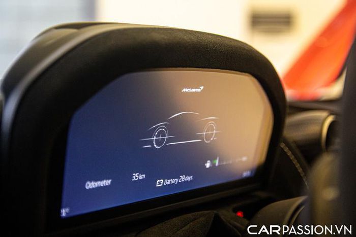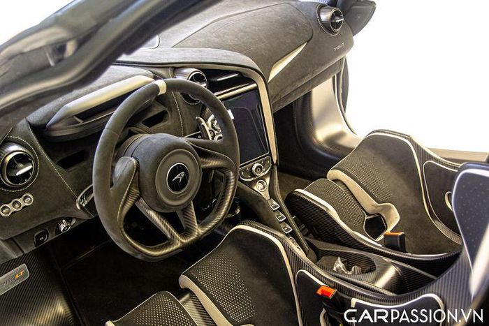 Về nội thất, chiếc 765LT màu Nardo Orange độc nhất Việt Nam được bọc da Alcantara màu đen cùng các chi tiết trang trí bọc da Alcantara màu trắng xám. Khoang nội thất của xe sở hữu hàng loạt chi tiết carbon như ốp cửa gió điều hòa, ốp vô lăng, hai bên ốp cửa cùng bộ ghế đua carbon cực mỏng.