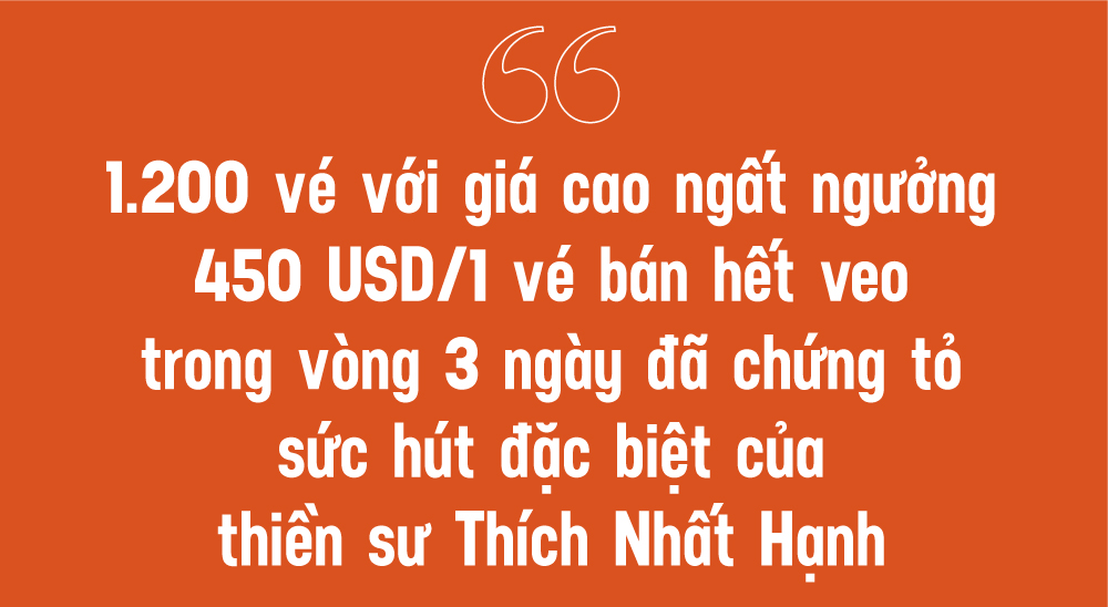 1.200 vé với giá cao ngất ngưởng 450 USD/1 vé bán hết veo trong ṿng 3 ngày đă chứng tỏ sức hút đặc biệt của thiền sư Thích Nhất Hạnh. Song điều đó cũng cho thấy phần nào tảng băng ch́m trong đời sống tâm linh nước Mỹ. Dường như người Mỹ cũng đang phải đối diện với những khổ đau, những căng thẳng, âu lo và sợ hăi. Dường như chính họ cũng đang bế tắc trong việc truy t́m bến bờ của hạnh phúc, an lạc.