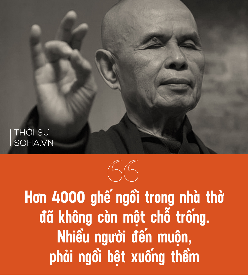 Tôi cũng nhớ như in buổi thuyết pháp của thầy tại nhà thờ lớn nhất của thành phố Boston. Hơn 4000 ghế ngồi trong nhà thờ đă không c̣n một chỗ trống. Nhiều người đến muộn, phải ngồi bệt xuống thềm. Trên ṿm giáo đường, tượng chúa Giê-su giang tay cứu thế lồng lộng, bên dưới, thiền sư Thích Nhất Hạnh của Việt Nam nhỏ bé, mảnh khảnh trong bộ nâu ṣng nói về đạo Phật với giọng điệu nhẹ nhàng, thong thả.