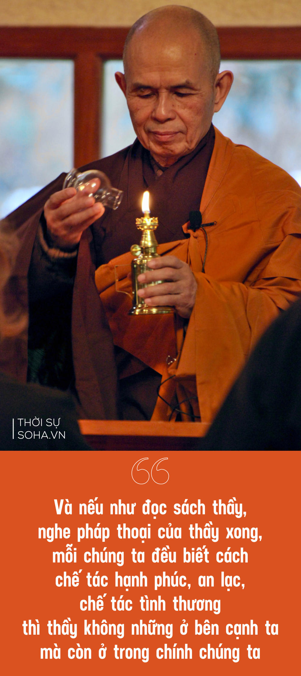 Thiền sư có nhắc đến vụ tự thiêu gây rúng động dư luận thế giới của Ḥa thượng Thích Quảng Đức tại Sài G̣n năm 1963. Thầy cho rằng đây là tín hiệu gửi cho cả thế giới, v́ muốn mọi người hăy lắng nghe tâm tư của những người khốn khổ. "Lắng nghe và thấu hiểu những đau khổ trong nội tâm sẽ giúp chúng ta giải quyết được hầu hết các vấn đề ta gặp phải. Muốn chữa lành cho người khác, trước tiên ta cần tự chữa lành cho chính ḿnh. Để làm được điều đó, ta phải biết cách giải quyết những vấn đề của bản thân. Tuy nhiên, hầu hết mọi người không biết lắng nghe và thấu hiểu những nỗi khổ của chính ḿnh".