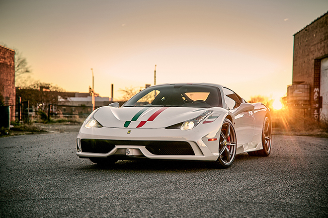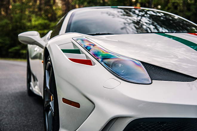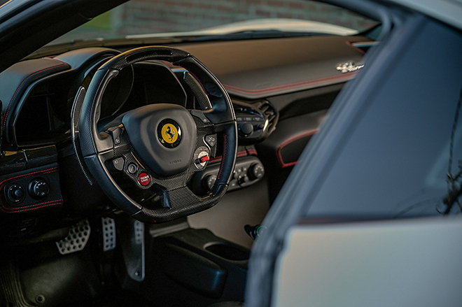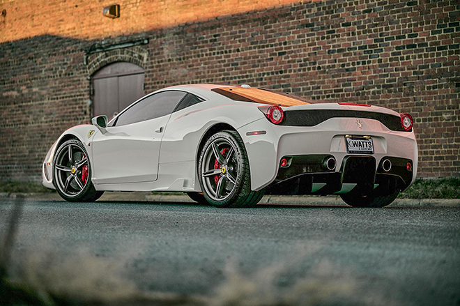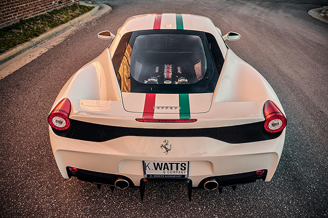 Chiếc Ferrari 458 Speciale trong bài được chào bán bởi đại lý Ferrari chính hãng tại Los Angeles và được mua bởi chủ sở hữu đầu tiên vào năm 2015, sau đó được chuyển đến Bắc Carolina. Ngoại thất xe được hoàn thiện với màu sơn trắng Bianco Avus, kết hợp cùng sọc đua NART (North American Racing Team) màu đỏ và xanh lá cây nổi bật.