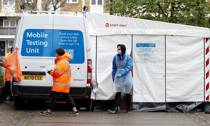 Nhân viên y tế Anh tại một trạm xét nghiệm lưu động ở London tháng 5/2021. Ảnh: Reuters.