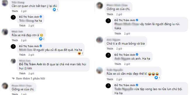 Hiện tại Trâm Anh đã khóa chức năng bình luận trong trang cá nhân, chỉ những người trong danh sách bạn bè mới có thể comment các bài viết. Dưới bài đăng mới nhất, bạn bè trêu chọc Trâm Anh: “Cần cơ quan chức năng bắt bạn ấy lại đi”; “Rửa xe có cần mặc đẹp thế không”… Khi một người bạn nhắn: “Rửa xe mà đẹp như thế này á”, Trâm Anh liền nhắc tới một người: “Lỡ người yêu cũ đi qua đỡ quê”. Câu trả lời hóm hỉnh của cô nàng cũng chính là tâm lý chung với nhiều cô gái. Dù trong hoàn cảnh nào cũng phải thật đẹp để không ngại ngùng trước người yêu cũ.
