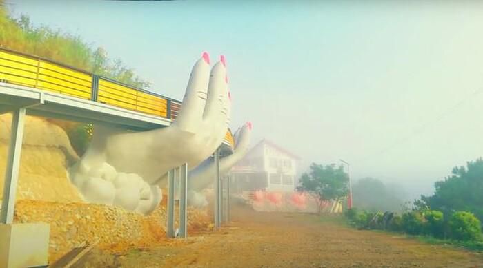 Cũng tạo dáng bàn tay đỡ lấy cầu nhưng những ngón tay của chiếc cầu này trông thô hơn, đặc biệt là phần móng tay còn được sơn màu đỏ chói.