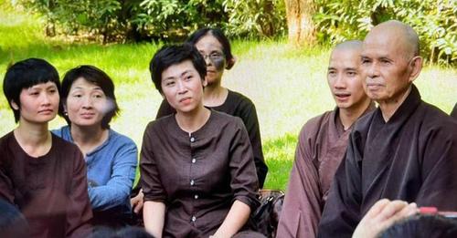Ca sĩ Lô Thủy (thứ ba từ trái sang) ngồi cùng Thiền sư Thích Nhất Hạnh trong một khóa tu tại Làng Mai Thái Lan. Ảnh: NVCC