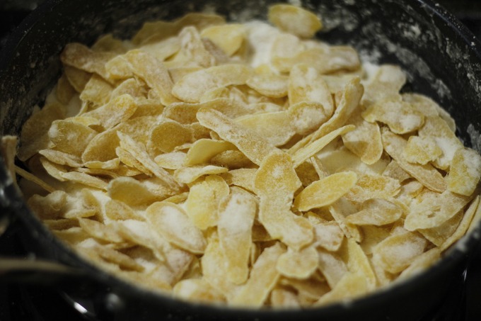 Đun sôi khoảng 2 lít nước cùng phèn chua, sau đó bỏ gừng đã rửa sạch vào đun sôi từ 8 – 10 phút. Sau khi đun sôi, vớt gừng rửa sạch với nước lạnh từ 2 – 3 lần cho hết phèn, sau đó để ráo nước.