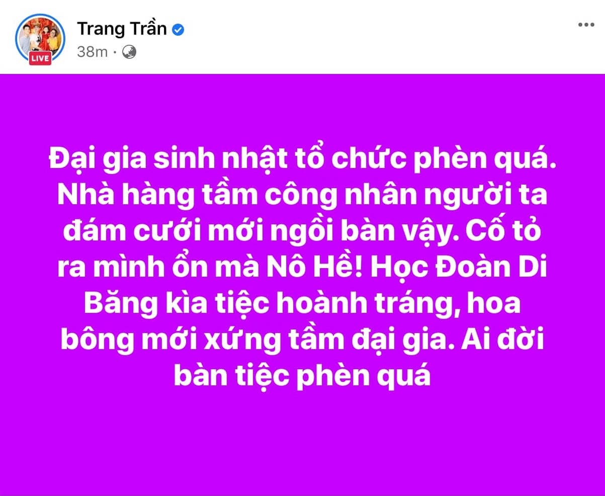 Cụ thể, trên trang facebook cá nhân của mình, Trang Trần viết: “Đại gia sinh nhật tổ chức phèn quá. Nhà hàng tầm công nhân người ta đám cưới mới ngồi bàn vậy. Cố tỏ ra mình ổn mà Nô Hề. Học Đoàn Di Băng kìa, tiệc hoành tráng, hoa bông mới xứng tầm đại gia. Ai đời bàn tiệc phèn quá.”