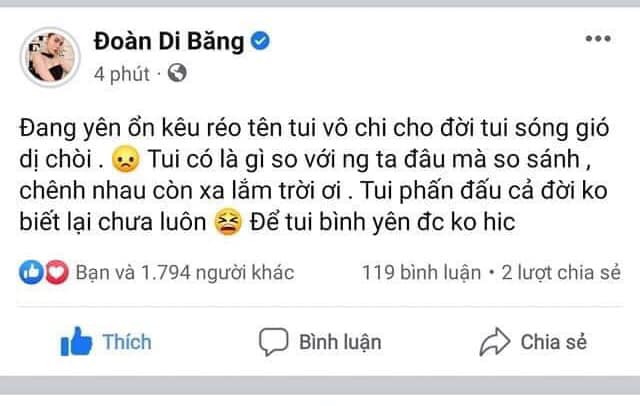 Nữ ca sĩ Đoàn Di Băng lên tiếng khi bị ai đó réo tên: “Đang yên ổn kêu réo tên tôi vô chi cho đời tôi sóng gió vậy trời? Tôi có là gì so với người ta đâu mà so sánh, chênh nhau còn xa lắm trời ơi. Tôi phấn đấu cả đời không biết lại chưa luôn. Để tôi bình yên được không?”,