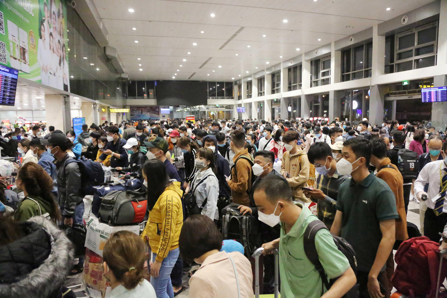 Hàng ngàn người rồng rắn xếp hàng dài ở sân bay Tân Sơn Nhất để làm thủ tục lên máy bay về quê đón Tết, sum họp cùng gia đình.