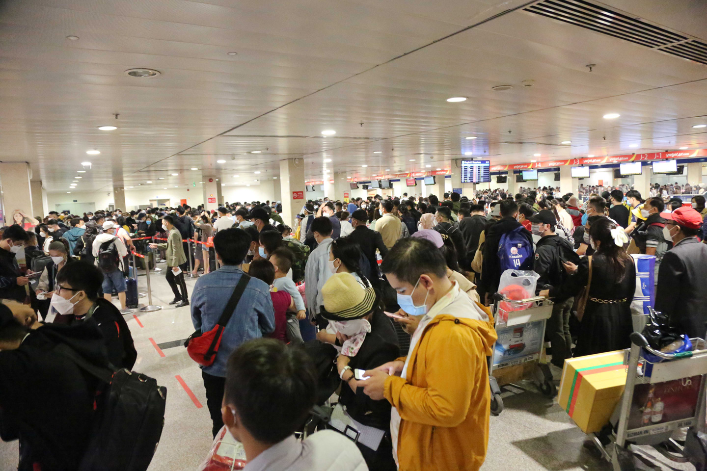 Tại quầy check in của hãng hàng không Jetstar, Vietjet Air và Bamboo Airways hàng nghìn người xếp hàng dài từ quầy ra tới cổng. Nhiều người phải chờ đợi cả tiếng đồng hồ mới làm được thủ tục check in.