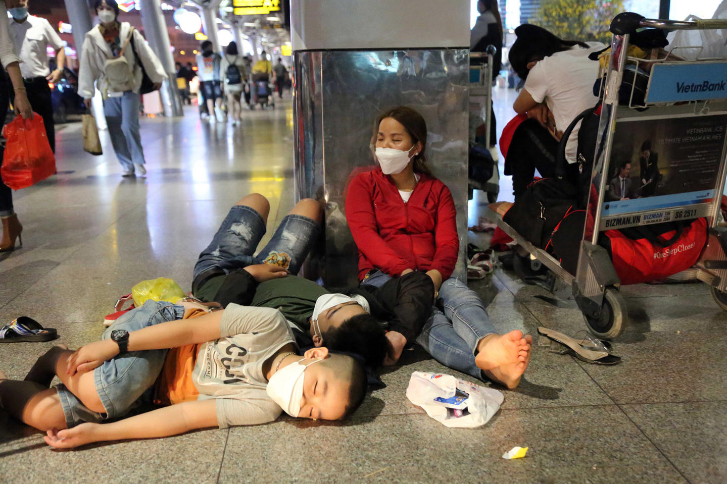 Người lớn, trẻ nhỏ đều tỏ ra mệt mỏi ở sân bay do lượng người quá đông.