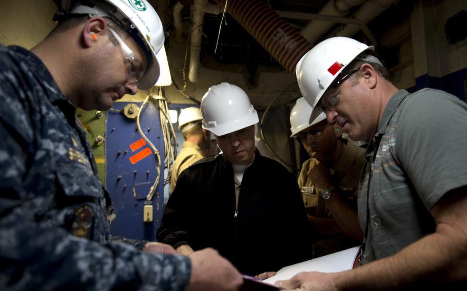 Stephen Shedd (trái) đang làm việc cùng các kỹ sư hồi năm 2013. Ảnh: Karolina Martinez/Hải quân Mỹ.