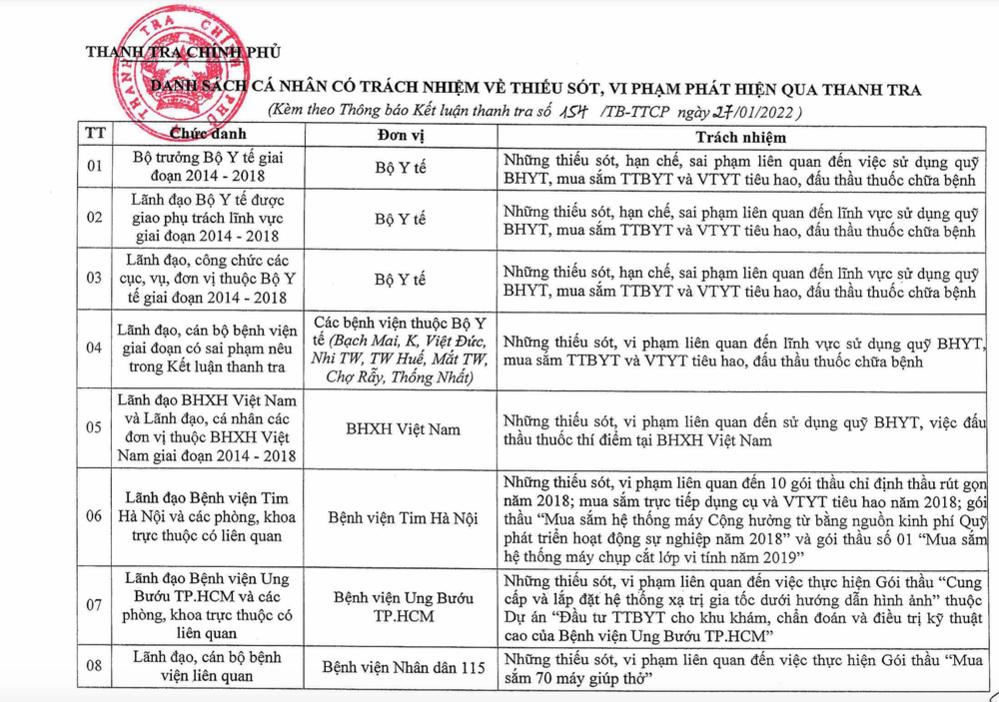 TTCP kết luận Bộ trưởng Bộ Y tế giai đoạn 2014-2018 (thời điểm đó là bà Nguyễn Thị Kim Tiến), lãnh đạo Bộ Y tế được giao phụ trách lĩnh vực giai đoạn 2014-2018, lãnh đạo các Cục, Vụ và đơn vị thuộc Bộ Y tế giai đoạn 2014-2018, là những cá nhân phải chịu trách nhiệm về các thiếu sót, hạn chế, sai phạm liên quan việc sử dụng quỹ bảo hiểm y tế; mua sắm trang thiết bị y tế và vật tư tiêu hao; đấu thầu thuốc chữa bệnh.