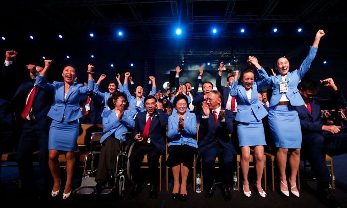 Phái đoàn Trung Quốc tại thủ đô Kuala Lumpur của Malaysia năm 2015 ăn mừng thông tin Bắc Kinh được chọn đăng cai Olympic mùa đông 2022. Ảnh: AFP.