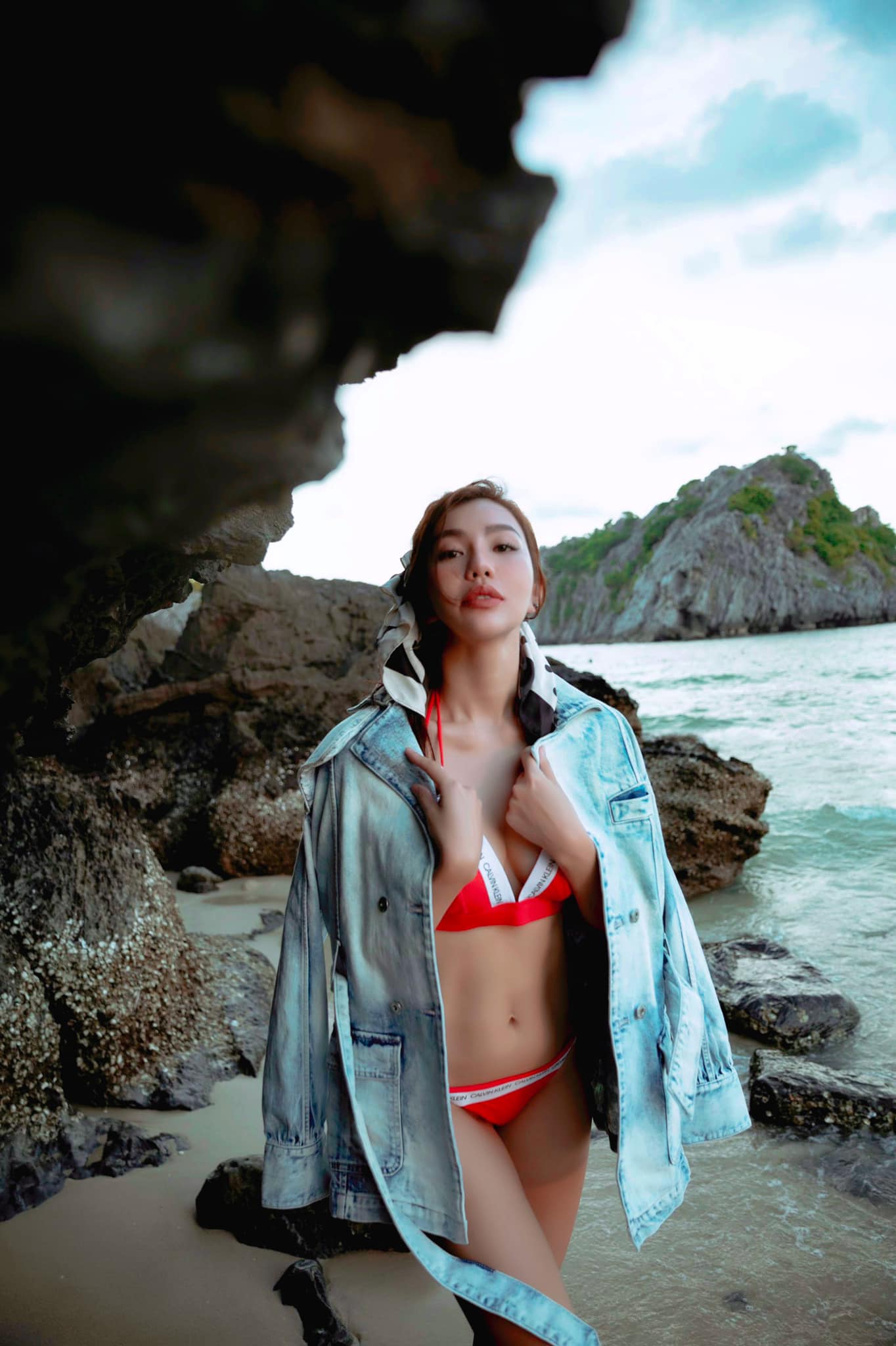 Lần khác, cũng diện bikini nhưng MC Hải Anh lại khoác ngoài thiết kế denim vô cùng mới mẻ. Thiết kế áo tắm này cũng thiên về phong cách thể thao nên không bị "lạc quẻ".