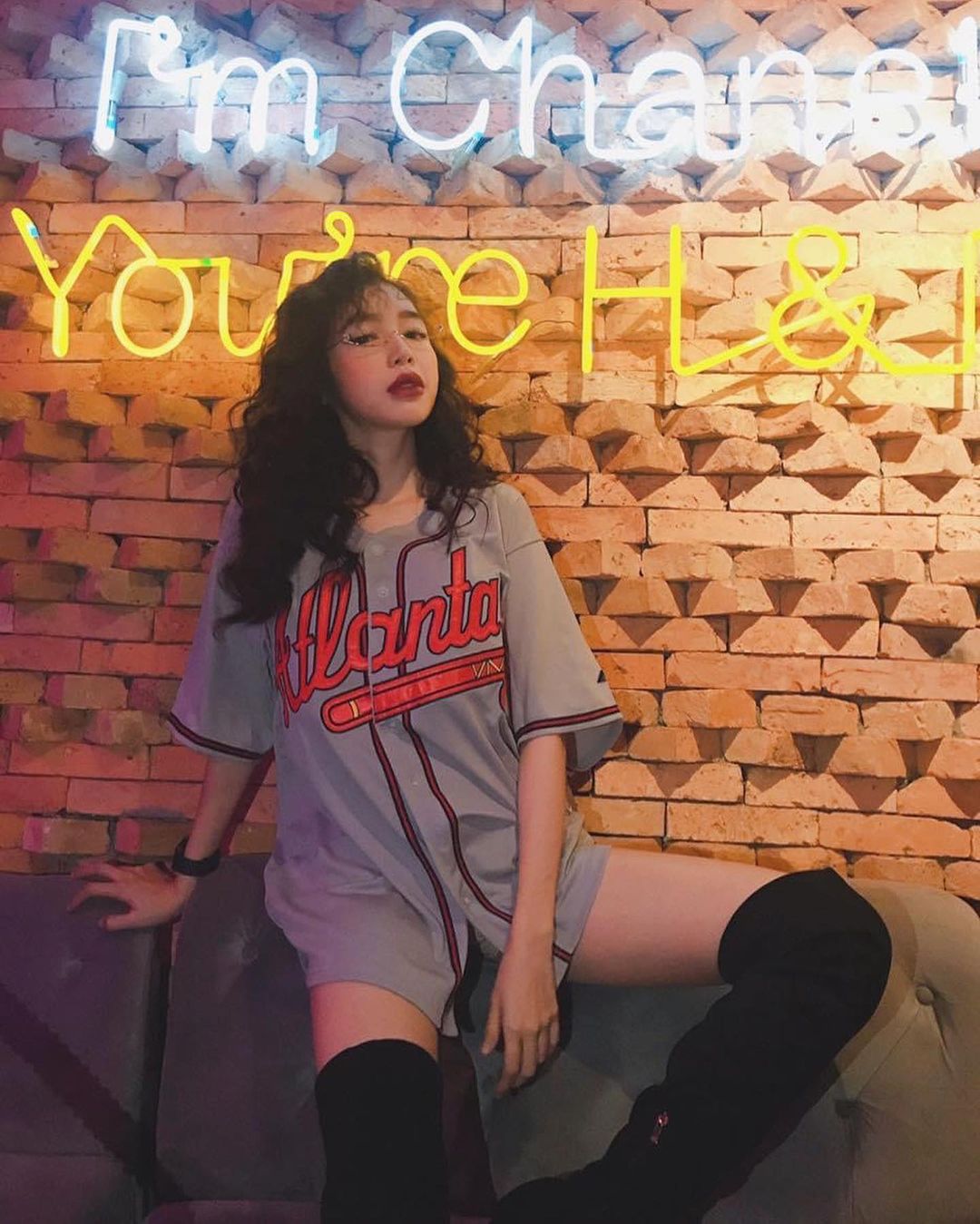 Elly Trần cá tính với áo bóng chày dáng dài kết hợp với boots đùi.