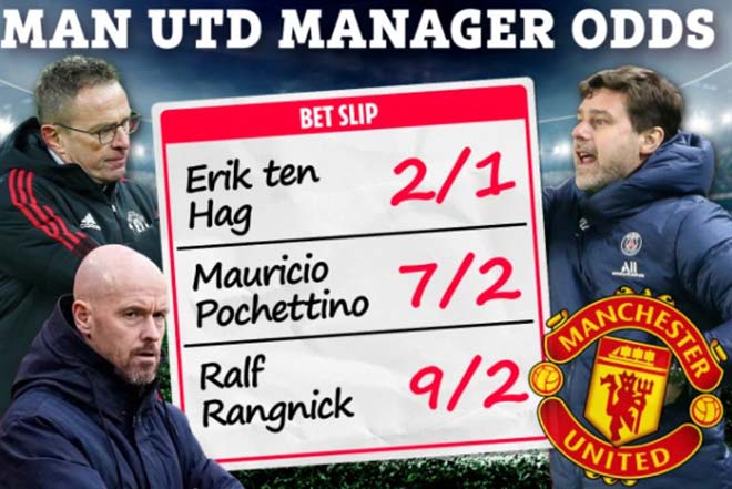 Cụ thể, HLV của Ajax Erik ten Hag mới là cái tên được kỳ vọng cao nhất với tỉ lệ cược 2/1 (đặt 1 ăn 2) cho vị trí “ghế nóng” dài hạn của sân Old Trafford. Pochettino xếp thứ 2 với tỉ lệ 7/2. Rangnick đứng thứ 3 với tỉ lệ 9/2, Didier Deschamps và Brendan Rodgers cùng ở mức 11/2, trong khi Diego Simeone ở mức 12/1.