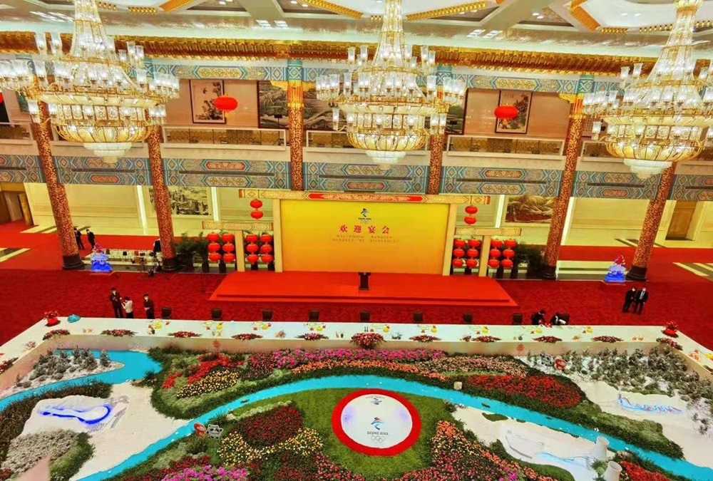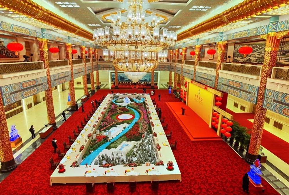 Bàn tiệc lớn được trang trí tiểu cảnh mùa đông cùng mô hình một số điểm tổ chức thi đấu Olympic trong quốc yến trưa nay.