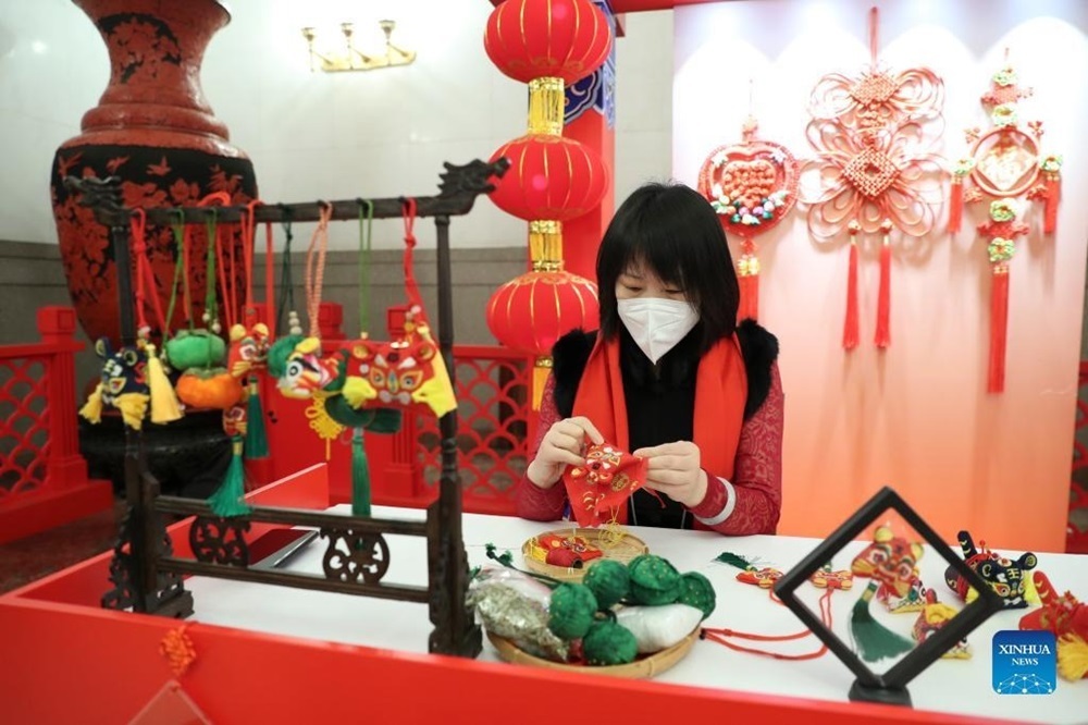 Ngoài tiệc tối, chương trình tiệc chiêu đãi còn bao gồm biểu diễn âm nhạc và di sản văn hóa phi vật thể của Trung Quốc. Trong ảnh, một phụ nữ trẻ đang làm đồ thủ công mỹ nghệ tại Đại lễ đường Nhân dân.