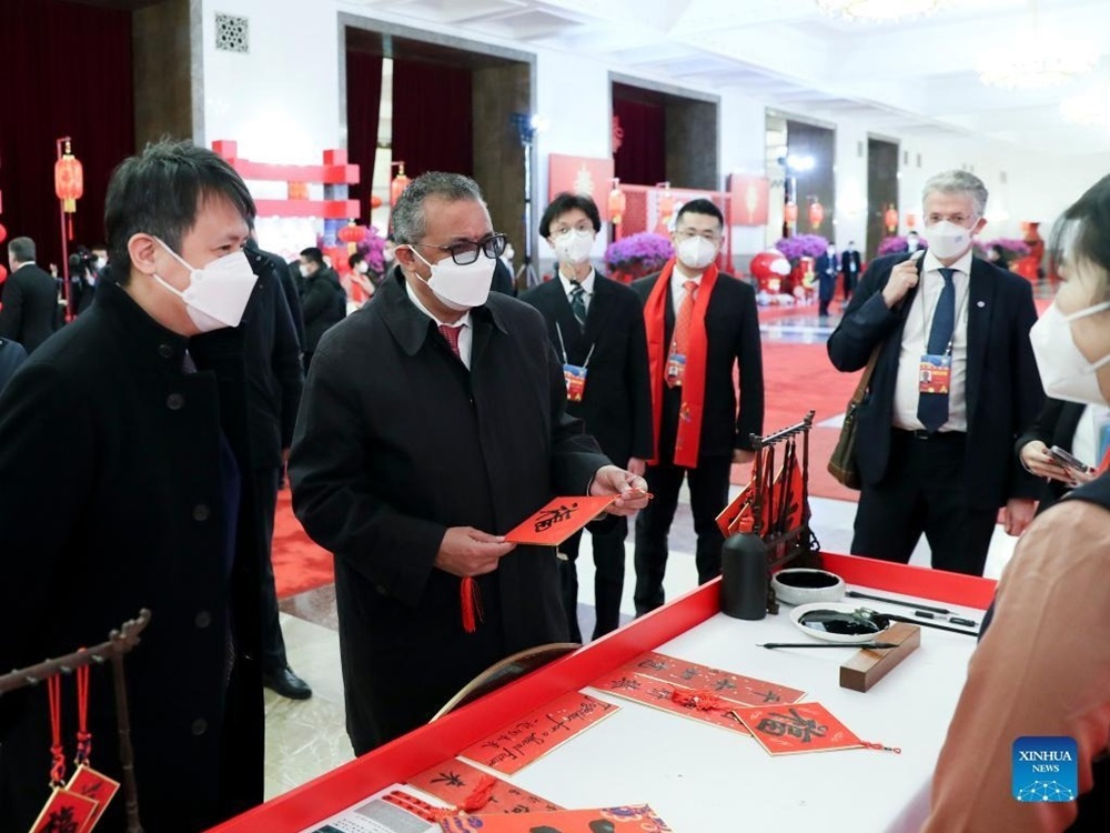 Tổng Giám đốc Tổ chức Y tế Thế giới (WHO) Tedros Adhanom Ghebreyesus xem buổi trình diễn di sản văn hóa phi vật thể của Trung Quốc trước khi dự tiệc chiêu đãi.