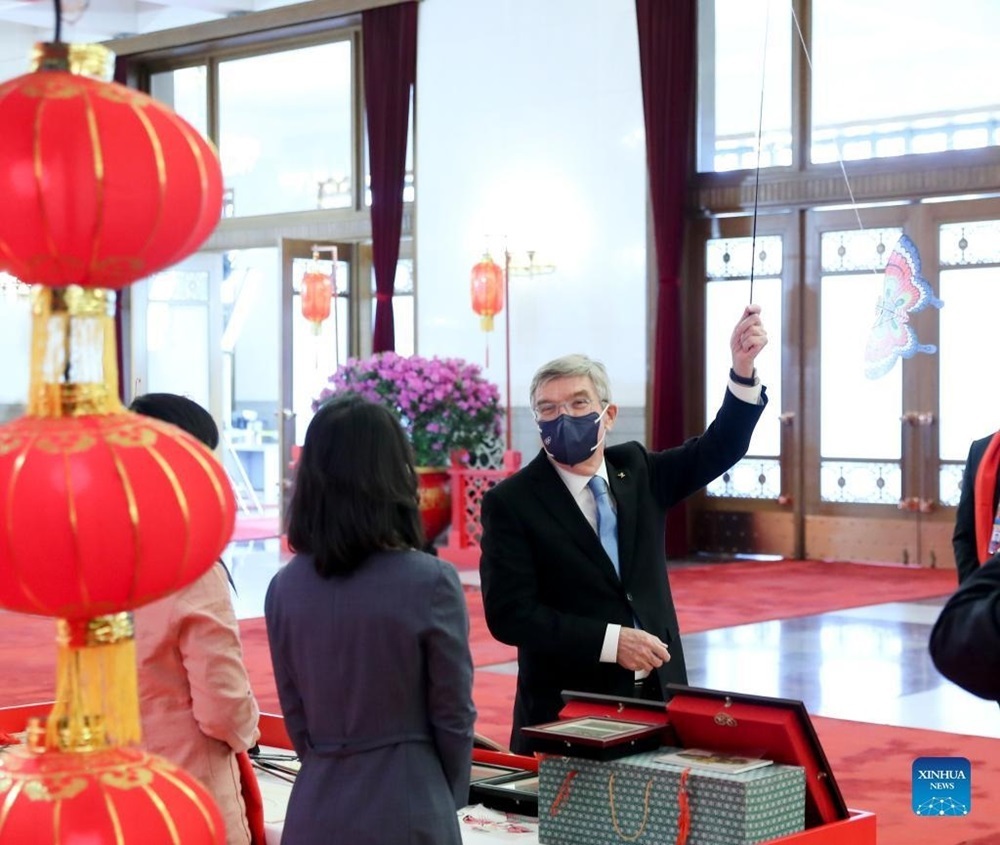 Chủ tịch Ủy ban Olympic Quốc tế (IOC) Thomas Bach trải nghiệm thả diều trong buổi trình diễn di sản văn hóa phi vật thể trước khi tham dự quốc yến.
