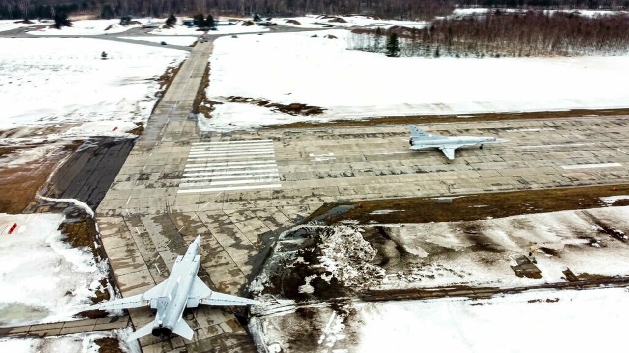Ảnh do Bộ Quốc Phòng Nga công bố ngày 05/02/2022: 2 máy bay ném bom Tu-22M3 của không quân Nga chuẩn bị cất cánh tham tập trận chung với Belarrus. AP