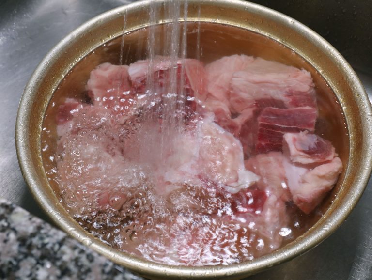 Bước 1: Rửa sạch xương trong nước lạnh sau đó ngâm nước 8 tiếng trong chậu lớn. Trong quá trình ngâm hãy thay nước một vài lần.
