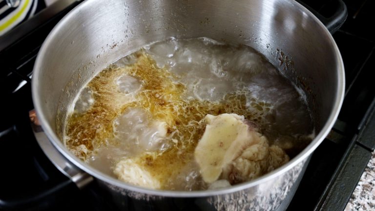 Bước 6: Tắt bếp, lọc hết xương ra khỏi nồi, vớt hết váng mỡ trên bề mặt và cho nước hầm có màu trắng sữa vào hộp đựng. Nước canh xương này có thể trữ đông lên đến 3 tháng.