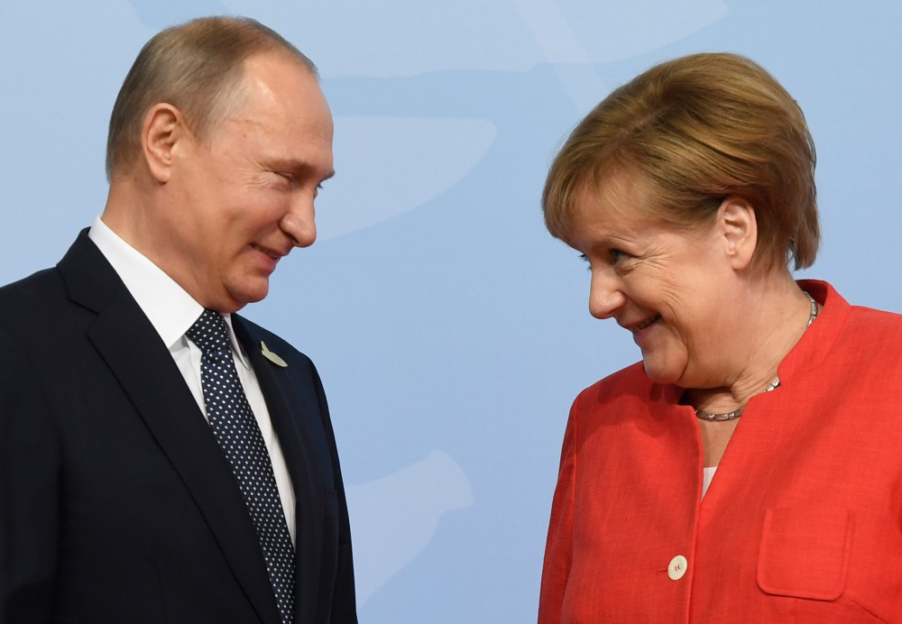Thủ tướng Đức Angela Merkel chào mừng Tổng thống Nga Vladimir Putin khi ông đến tham dự hội nghị thượng đỉnh G-20 ở Hamburg, miền bắc nước Đức, vào ngày 7 tháng 7 năm 2017. Ảnh: AFP