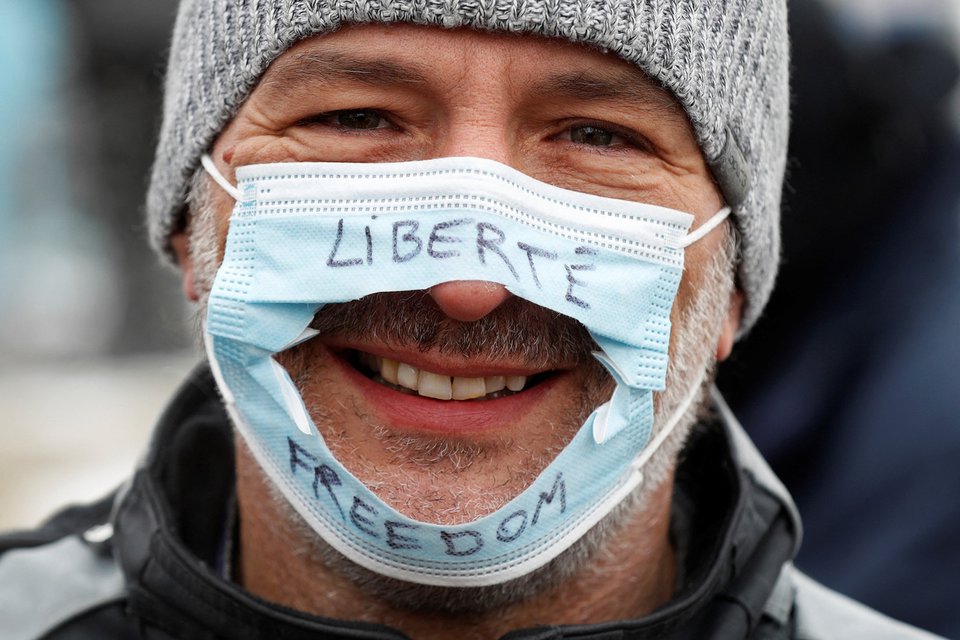 Theo BBC, cảnh sát bày tỏ lo ngại vì đoàn xe này đã thu hút nhiều thành phần cực hữu và cực đoan. Hôm 6/2, cảnh sát cho biết đang phải xử lý hơn 60 vụ điều tra hình sự có liên quan tới cuộc biểu tình. Một vài người đã bị bắt giữ và một số phương tiện đã bị tịch thu. Trong ảnh là một người tham gia cuộc biểu tình ngày 6/2, trên khẩu trang là chữ "tự do". Ảnh: Reuters.