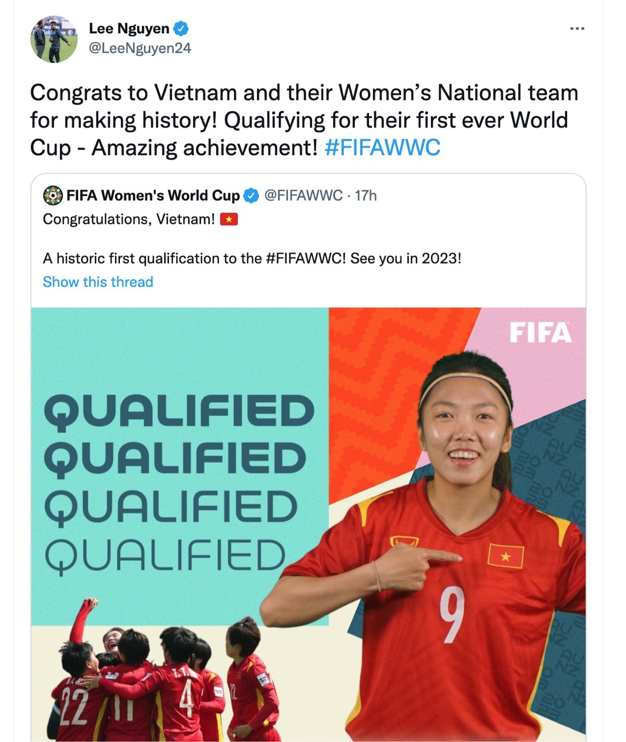 Trong dòng tweeet, Lee Nguyễn viết: “Đây là thành tích đáng kinh ngạc và rất đỗi tự hào với tuyển nữ Việt Nam. Các nữ cầu thủ Việt Nam cũng đã đưa bóng đá Việt Nam lên bản đồ bóng đá thế giới. Một chiến tích lịch sử! Xin chúc mừng Việt Nam!”.