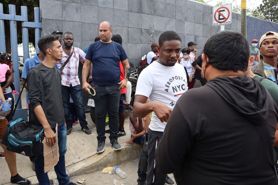 Những người di cư từ Venezuela đợi bên ngoài văn phòng Viện Di cư Quốc gia (INM) ở Tapachula, Mexico ngày 3/2. Ảnh: Reuters.