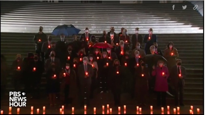 Các lãnh đạo Mỹ tưởng niệm người chết vì Covid-19 tại Đồi Capitol tối 7/2. Video: PBS.