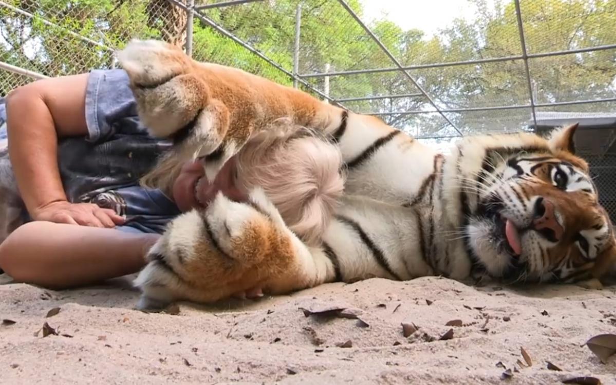Hổ cái Janda âu yếm ôm bà chủ Janice khi cả hai cùng nằm trên nền đất. Ảnh trich từ clip của Beastly.