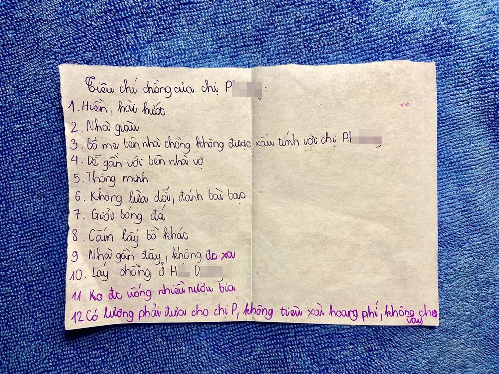 Nay mình đang nằm trên giường thì nó bật đèn học, thấy ghi chép dữ lắm mà mình lại gần xem thì che lại rồi kêu mình đi ra chỗ khác. Lát xong thì nó nhét cho mình tờ giấy này rồi dặn thêm: "Mốt có anh nào tới tán chị thì chị đưa cho anh đấy xem cái này nha chị, phải đạt đủ các tiêu chí kia thì em mới cho yêu".