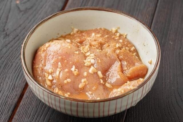 - Đầu tiên, trước khi chiên ức gà, chúng ta hãy ướp ức gà với các gia vị cần thiết như 1 thìa hạt tiêu đen, nửa thìa muối, 2 thìa xì dầu, 3 thìa rượu nấu ăn, 1 muỗng tinh bột, 2 muỗng tỏi băm nhỏ, 50ml nước lọc.